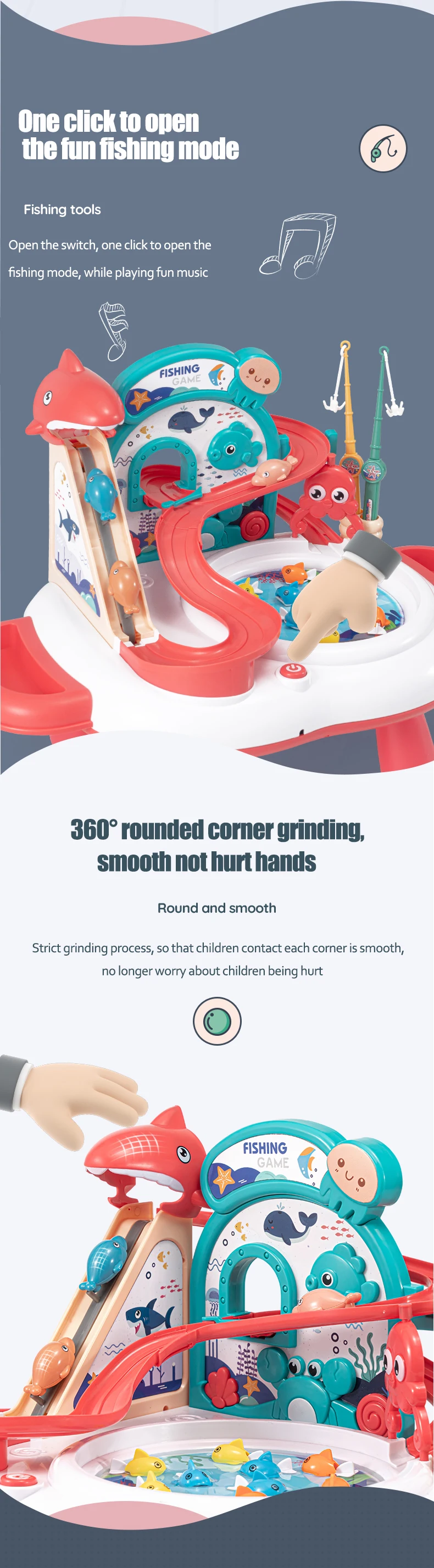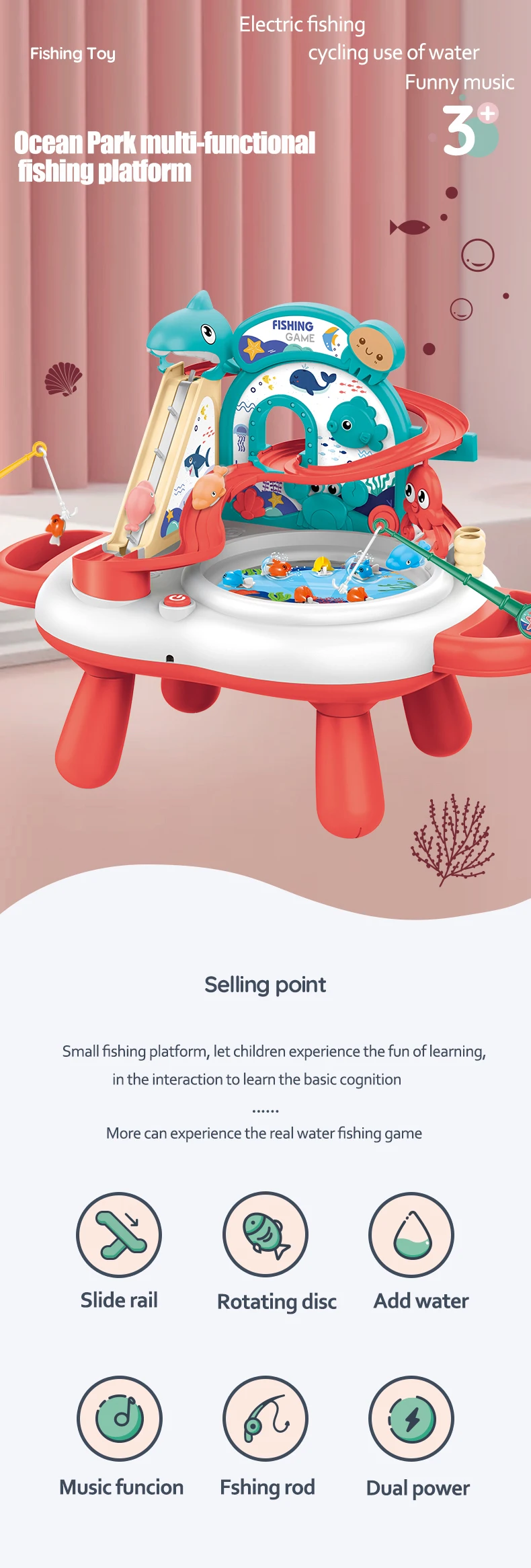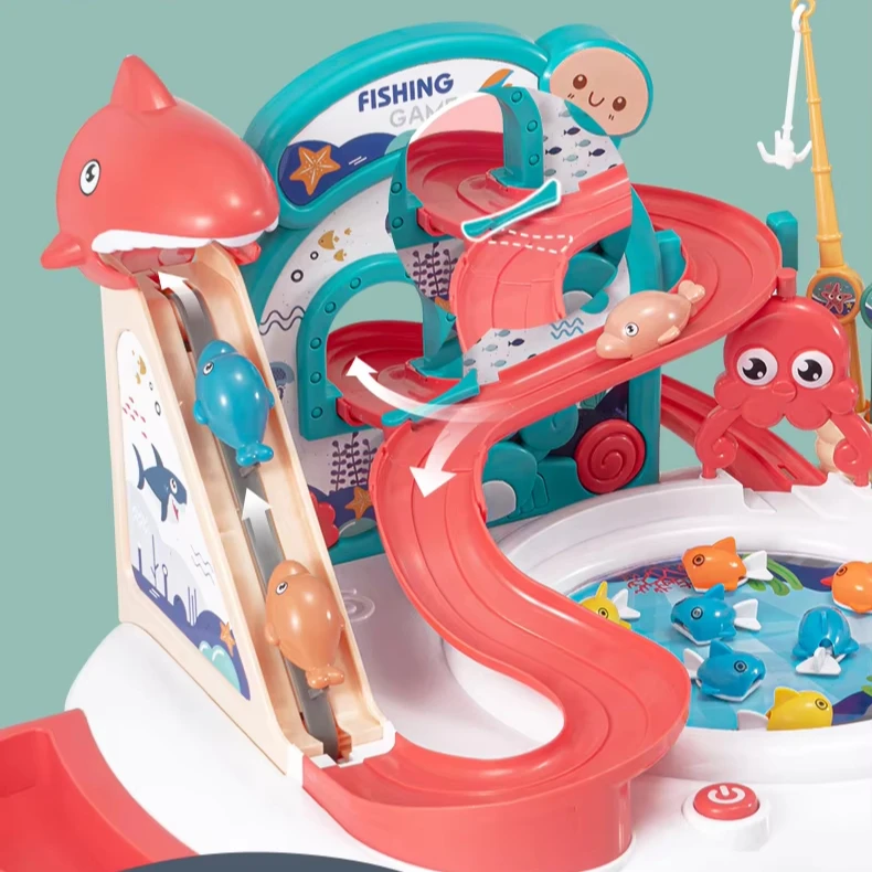 Kids Electric ABS Plastic Fishing Toys Music Slide & Rotary Fishing Reel Water Play Set with Battery Power for Ages 2-7